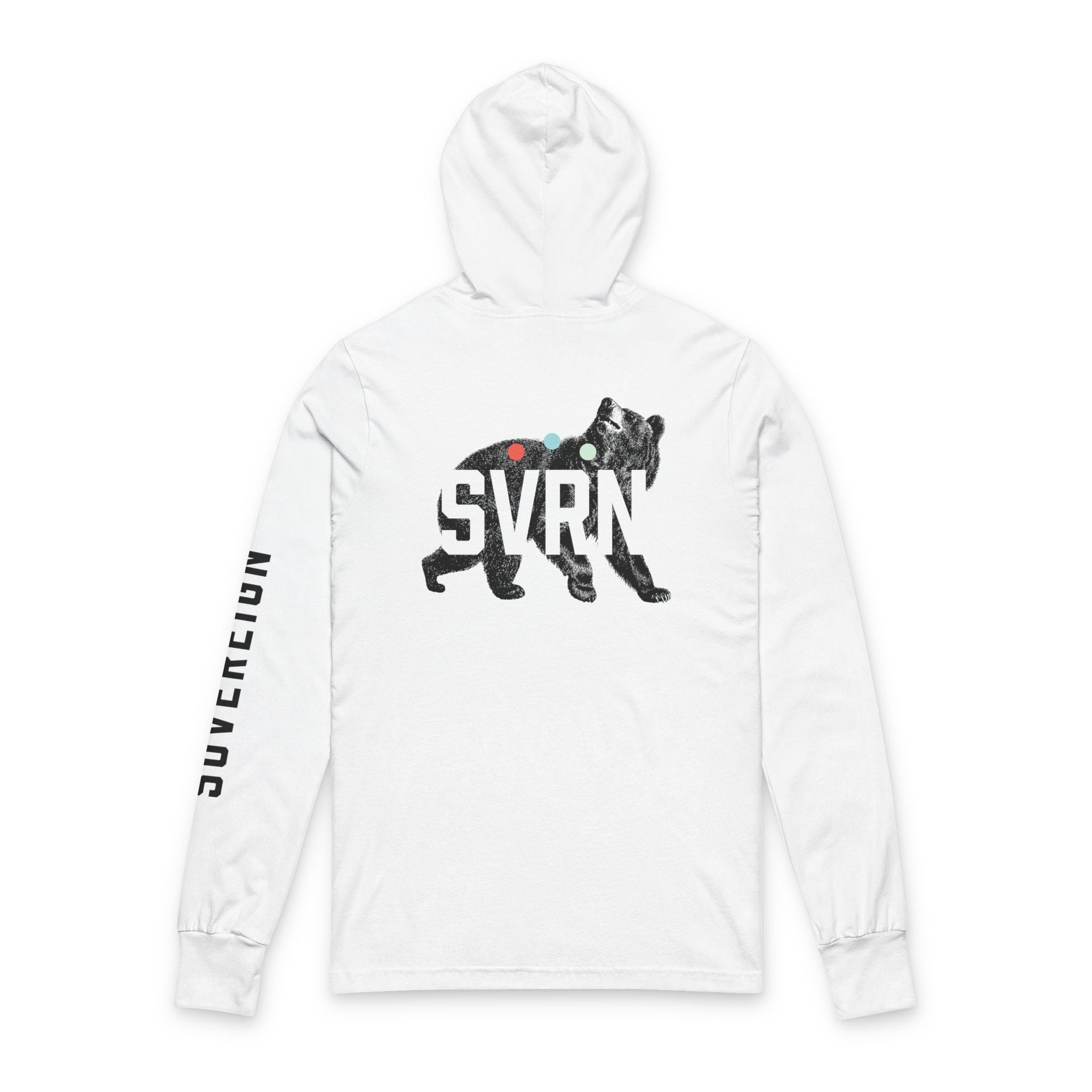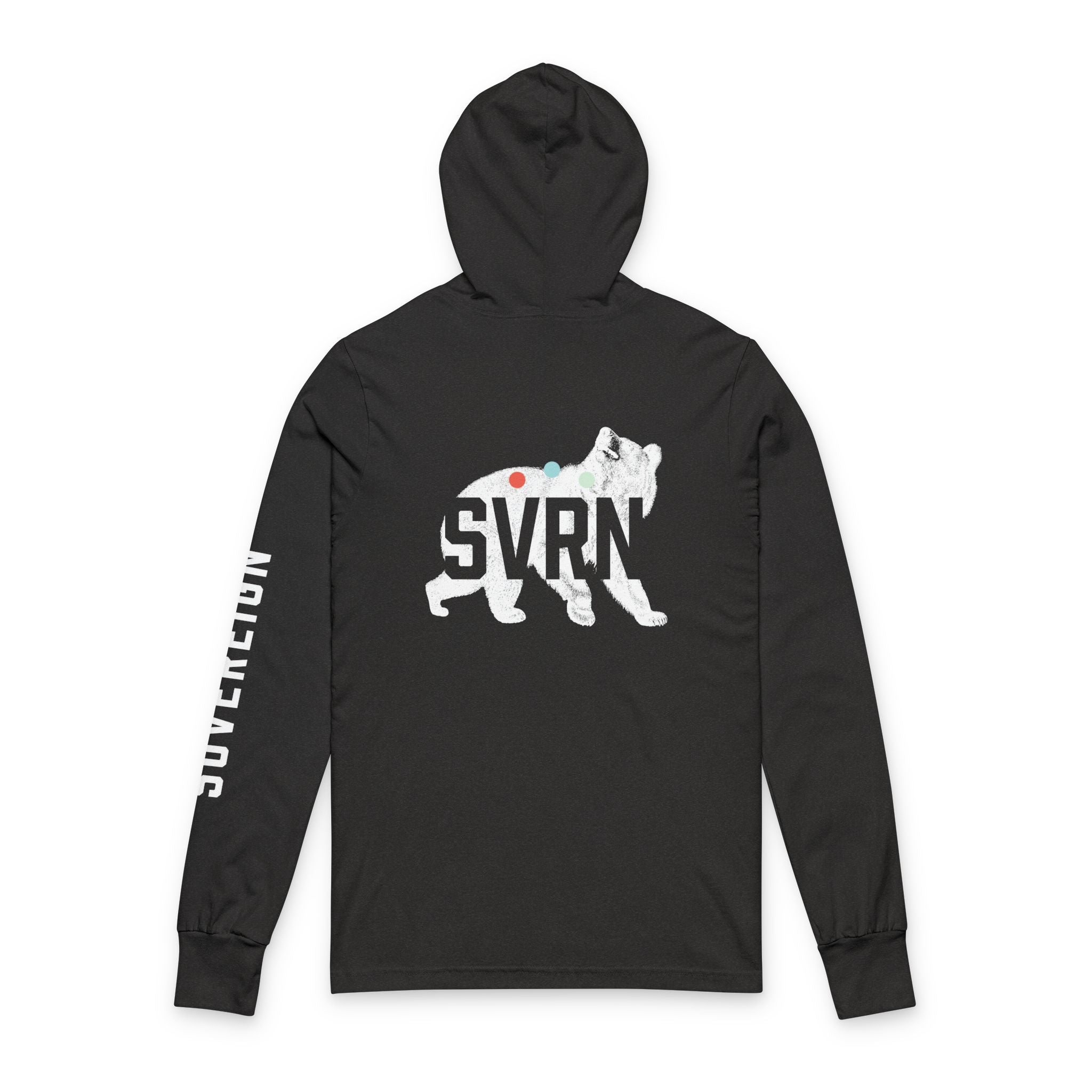 On the back, the design opens. The four-letter SVRN mark appears as a knockout over a vintage-style lithograph of the Black Bear—one of our Animal Ambassadors.