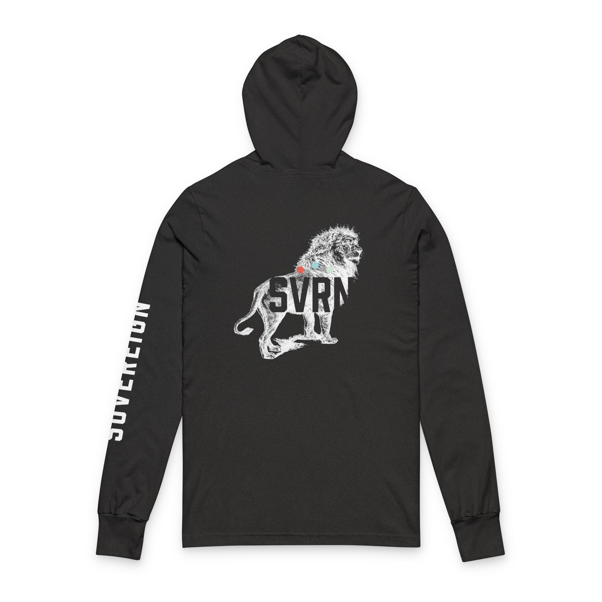 On the back, the design opens. The four-letter SVRN mark appears as a knockout over a vintage-style lithograph of the Lion—one of our Animal Ambassadors.