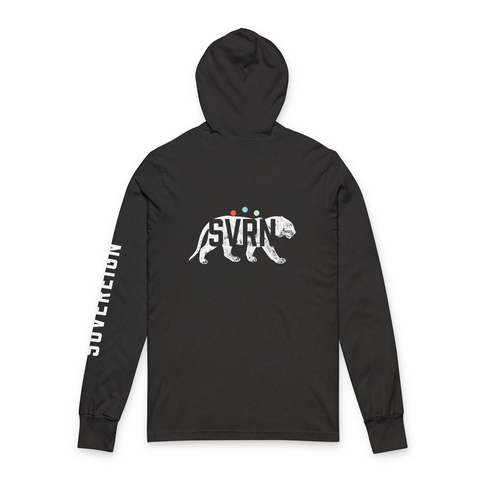 On the back, the design opens. The four-letter SVRN mark appears as a knockout over a vintage-style lithograph of the Tiger—one of our Animal Ambassadors.